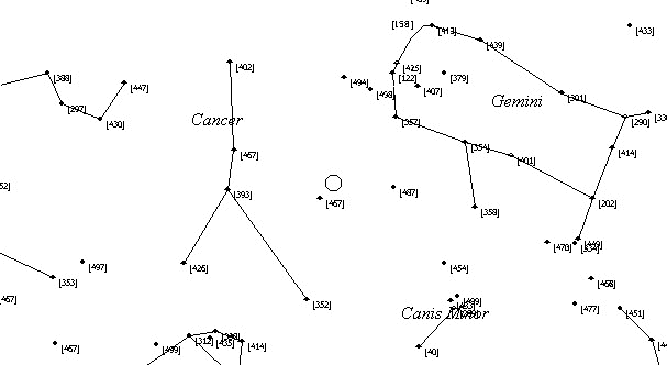 Wraz z postępem zaćmienia należy wykonywać wyznaczanie "granicznej" dla gwiazd zawsze w podobnej odległości od Księżyca. Tu znajdziesz mapkę [ 8 kB ] z Księżycem i gwiazdami w jego pobliżu 21 stycznia 2000 o 4:44 UT.