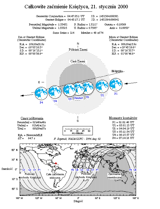 Momenty wejścia i zejścia cienia Ziemii podczas całkowitego zaćmienia Księżyca 21 stycznia 2000